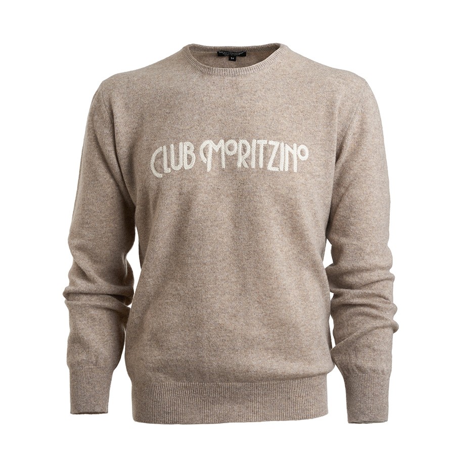The men’s cashmere sweater Club Moritzino light walnut melange features a white wool embroidery with the "Club Moritzino" logo on the front.
