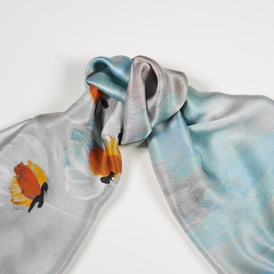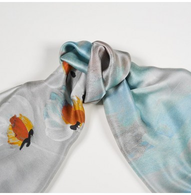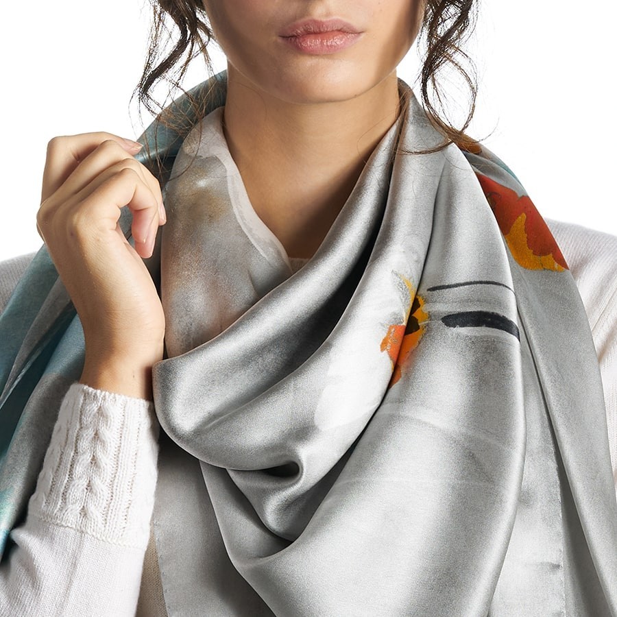 Glossy silk satin scarf, square shape 140x140mm. Hem finished with edge stitching. This head-scarf with a painted floral print is an elegant and versatile accessory, which can be worn around your head, on your neck or around the handle of your favourite bag. Made in Italy with excellent quality soft, lustrous, silk satin.