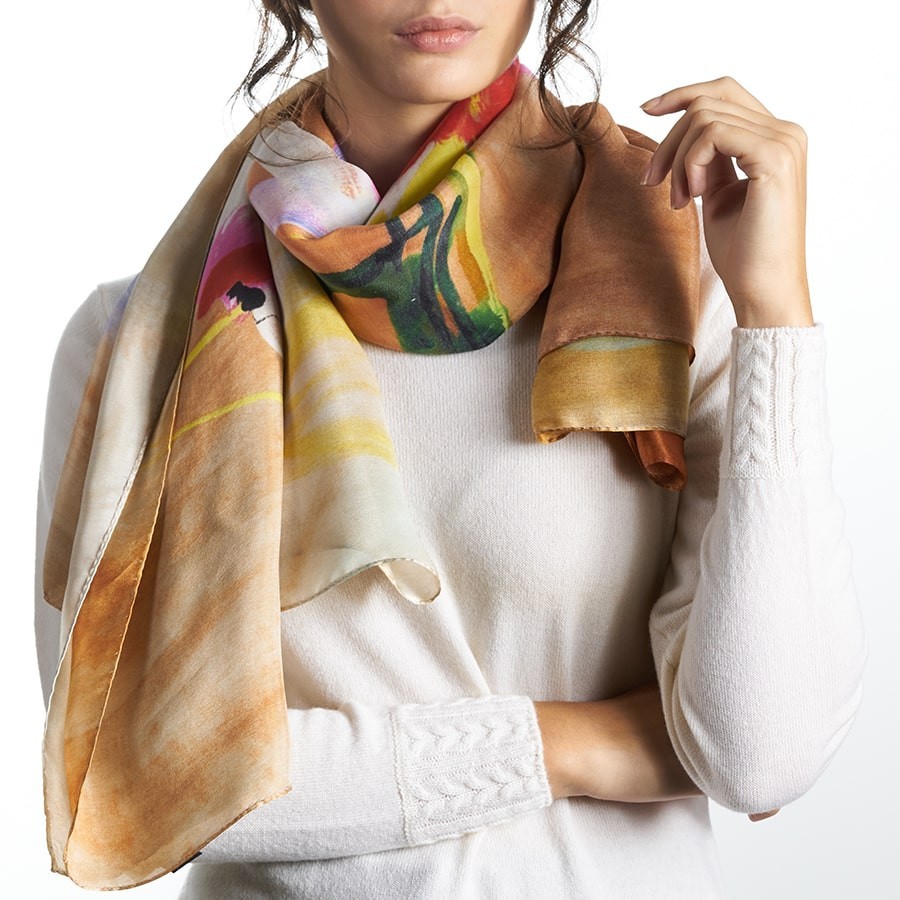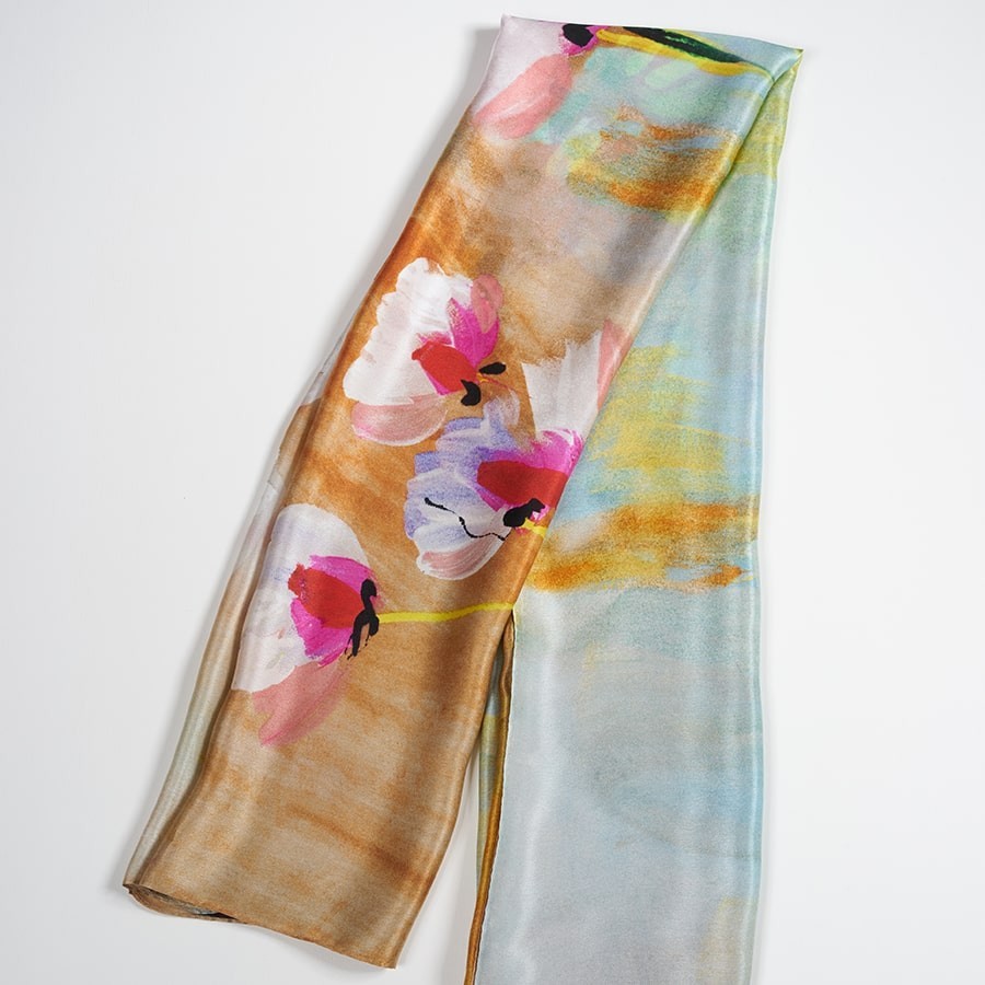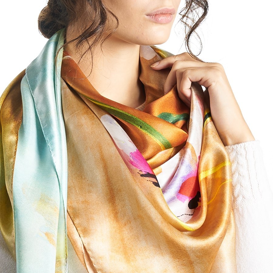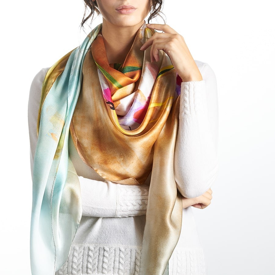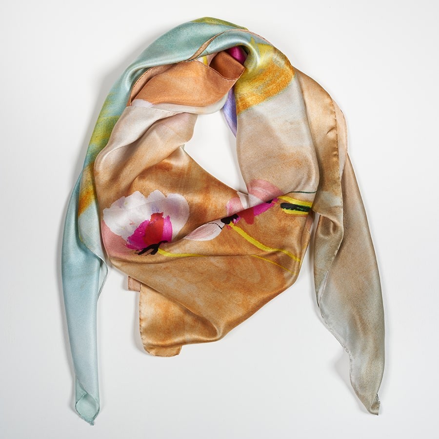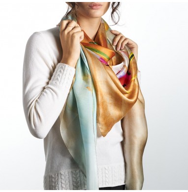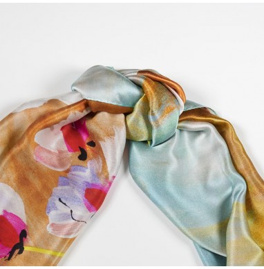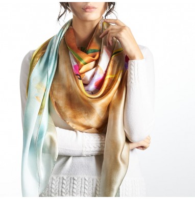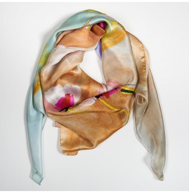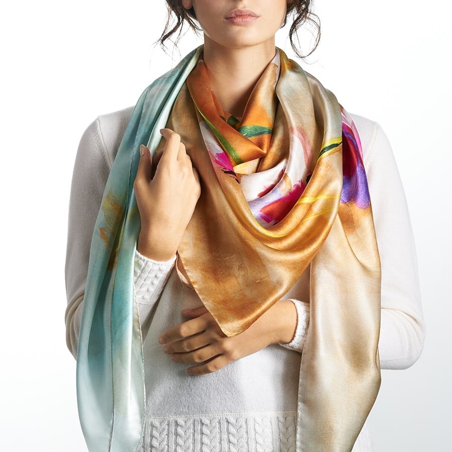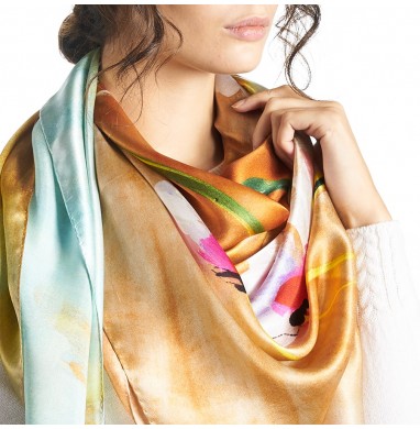 Glossy silk satin scarf, square shape 140x140mm. Hem finished with edge stitching. This head-scarf with a painted floral print is an elegant and versatile accessory, which can be worn around your head, on your neck or around the handle of your favourite bag. Made in Italy with excellent quality soft, lustrous, silk satin.