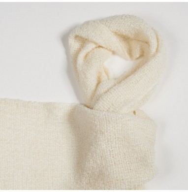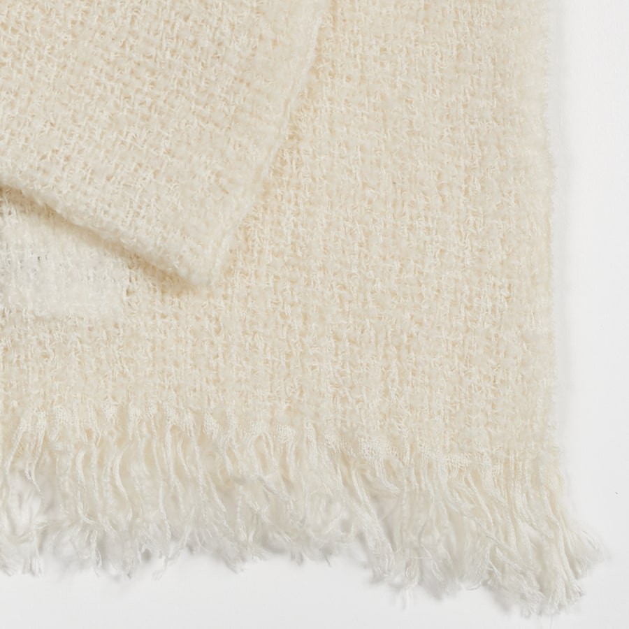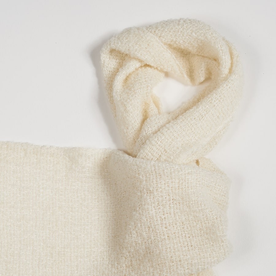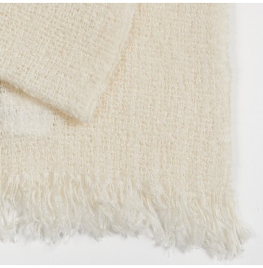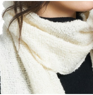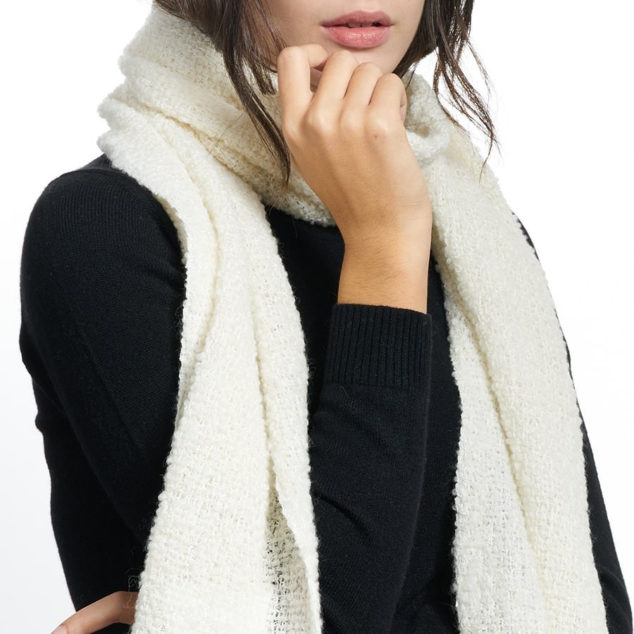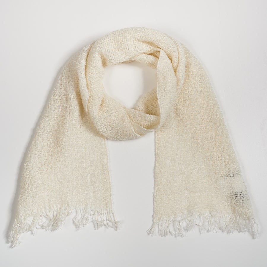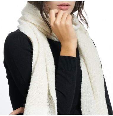 Handloomed scarf with bouclé fabric, fringed hem, light and warm in white colour.