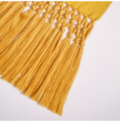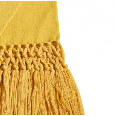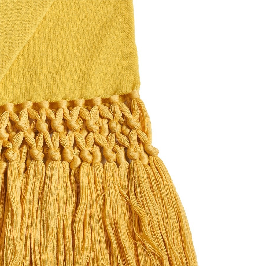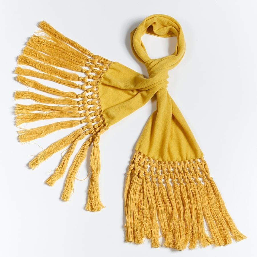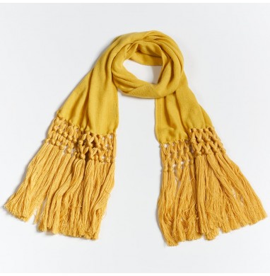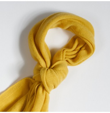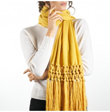 Knitted scarf made with 70% wool and 30% cashmere. The pure wool fringes are knotted by hand, in the same colour as the scarf.